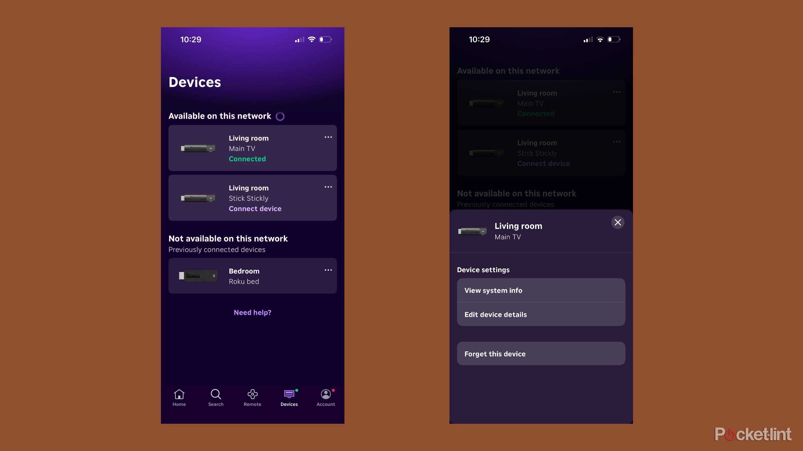 Some people prefer not to use their remote. If you've set up the Roku app with your Roku devices, then it will display all the ones that are on the same network that you're currently using in the Devices menu. As long as the network is the same, multiple devices will populate in the app at the same time. The IP address of those Rokus will be different, helping you know which one is which if you don’t have them nicknamed differently.
