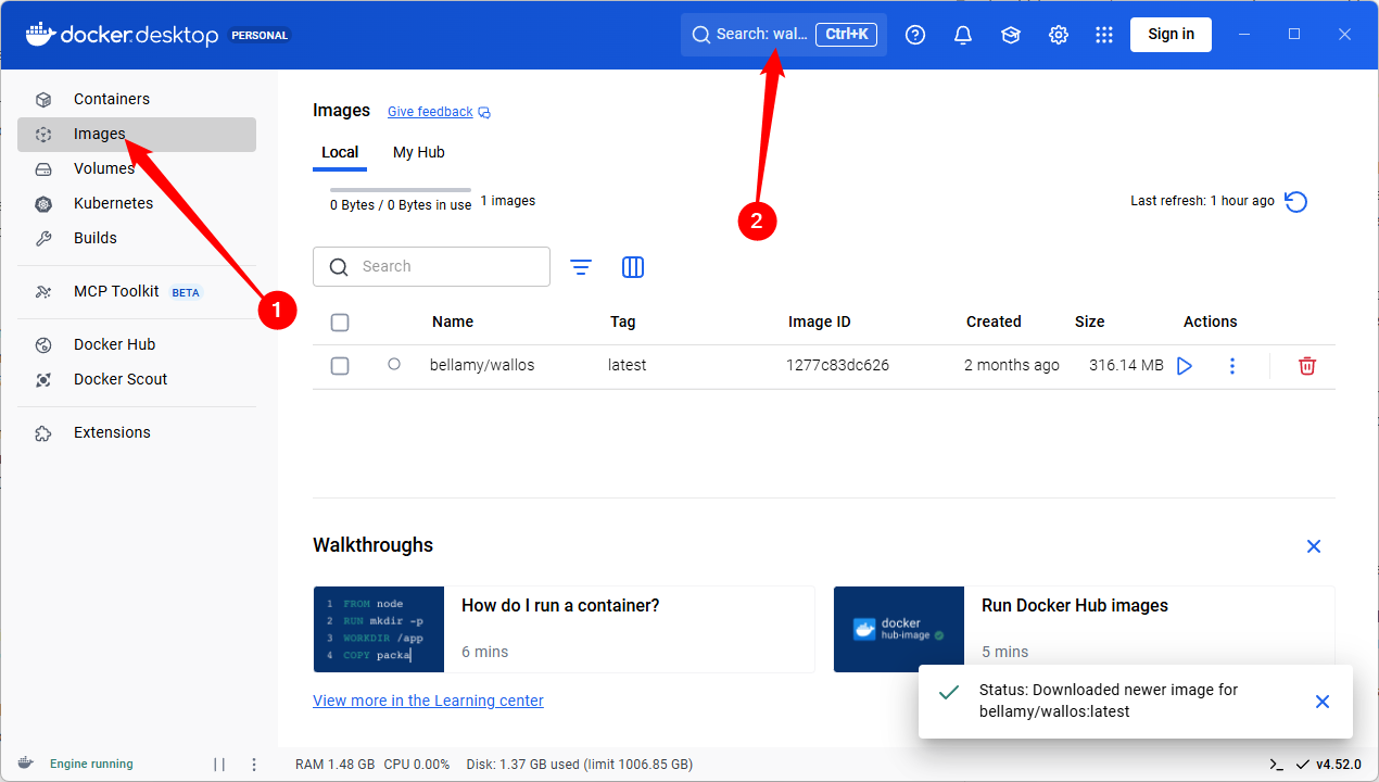 Just head to the Images tab, click the search bar at the top, then search Wallos. Once you find the result by bellamy, click "Run."