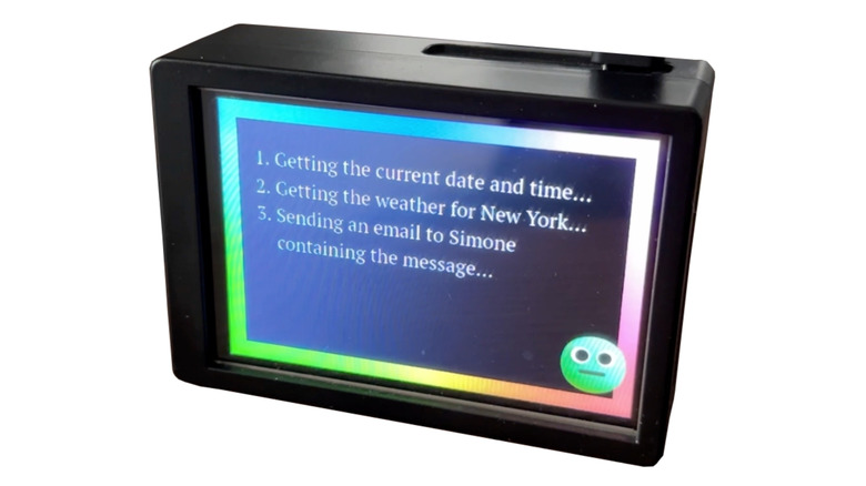 Max Headbox was designed to be an emotive, screen-based AI bot that displayed a face (created using GIMP to animate one of Microsoft's Fluent Emojis) and would react to voice commands once a wake word was spoken. Marzulli even set up touchscreen functionalities, where a tap would cue the system's microphone to start his spoken prompts.