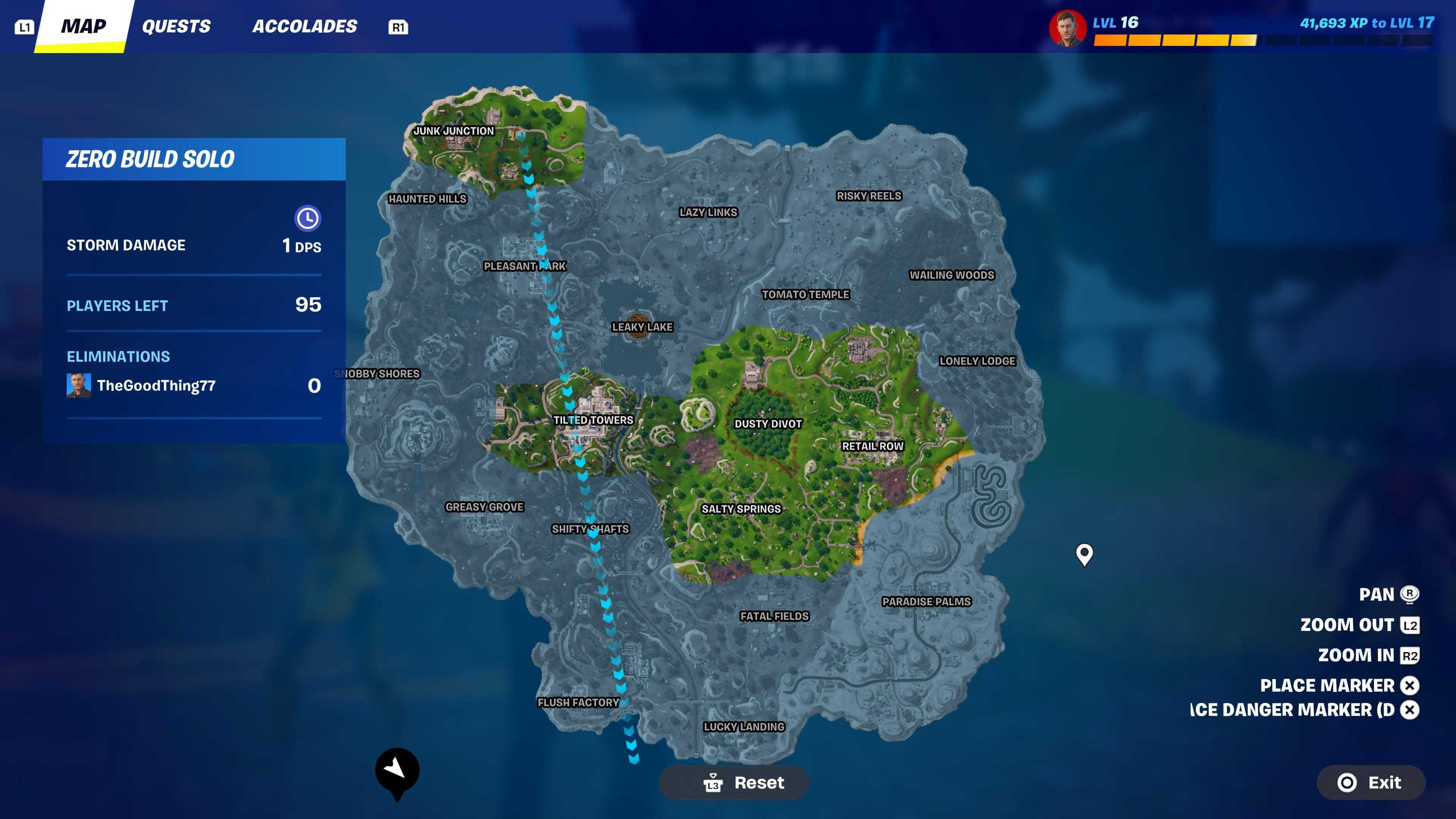 Above, you can see the current Fortnite OG map. It has been meticulously recreated, with every tree, car, chest, and object placed exactly where you remember them. Ziplines and ascenders have been added in Zero Build to improve movement. As the seasons change, we can expect the map to evolve as well. With Season 6, players will be able to jump into the floating island.