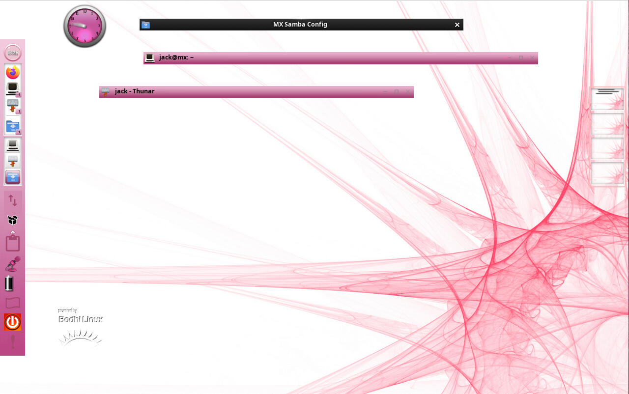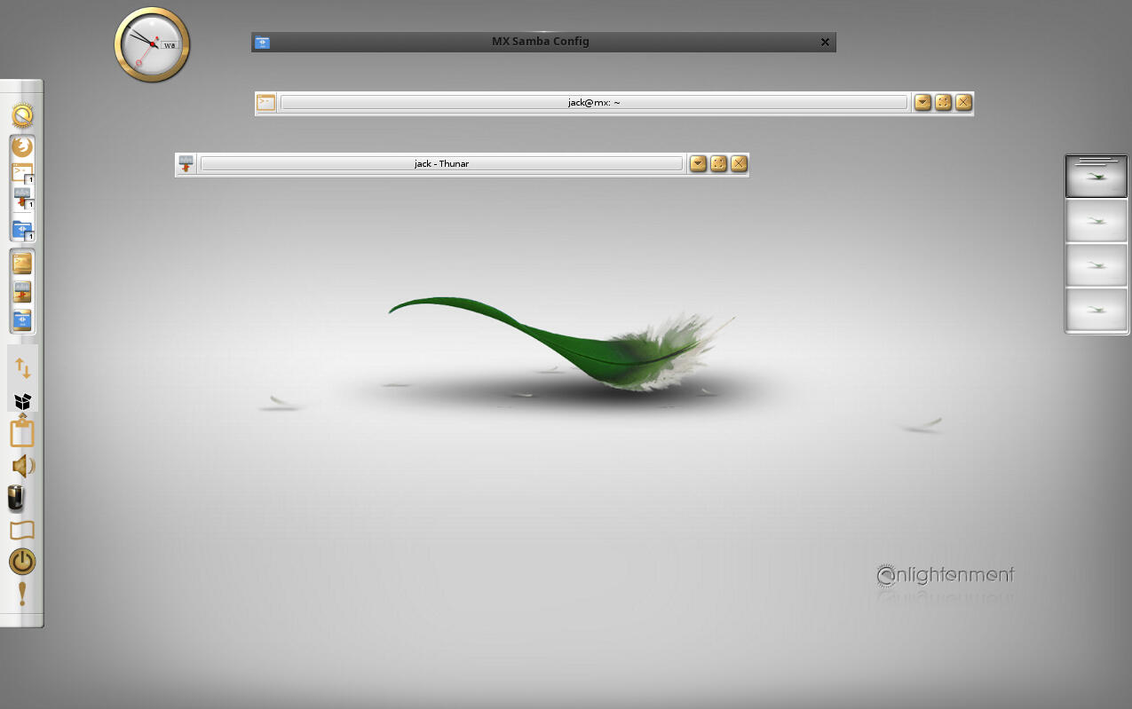 Another feature that stands out is the workspace management system. Enlightenment was one of the first desktop environments to introduce workspaces, and Moksha continues this tradition. Users can find a desktop applet on the right edge of the screen, displaying four workspaces. Applications can be easily moved between these spaces by dragging them via the thumbnail.