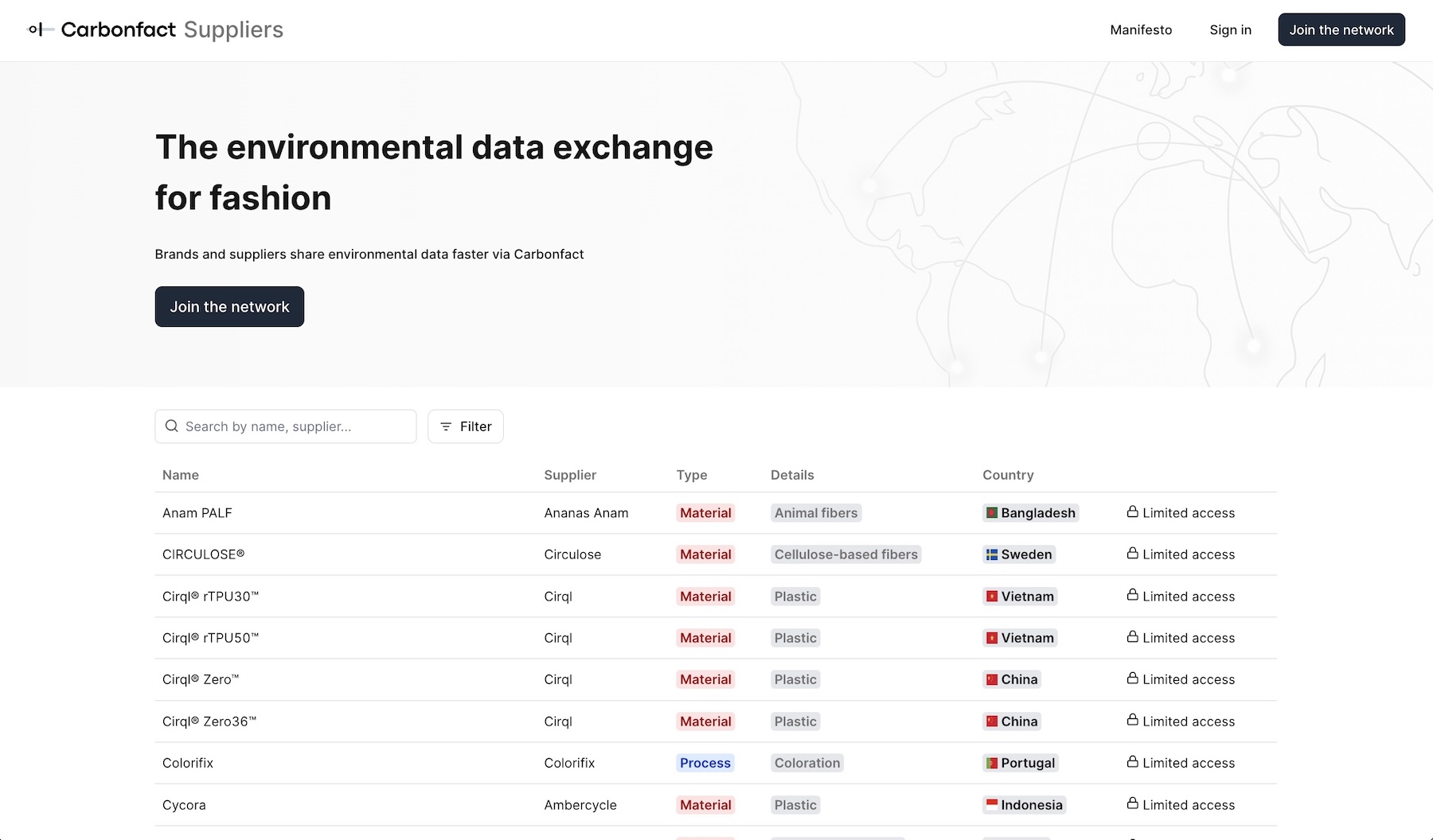 More than 20 top material creators, including Circulose, Manteco, and Recover, have already joined the platform by creating profiles and uploading their environmental data. New suppliers can request to join, submit their reports for free verification, or ask Carbonfact’s science team to generate a new report if necessary.