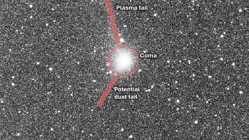 The Juice team didn’t want to wait that long, so they downloaded a quarter of a single image taken by NavCam. The image shows heat-driven activity on the comet during its close pass by the sun. The newly released image shows a coma, or a glowing halo of gas surrounding the comet, as well as two tails: a plasma tail composed of electrically charged gas, as well as a faint dust tail of solid particles being released.
