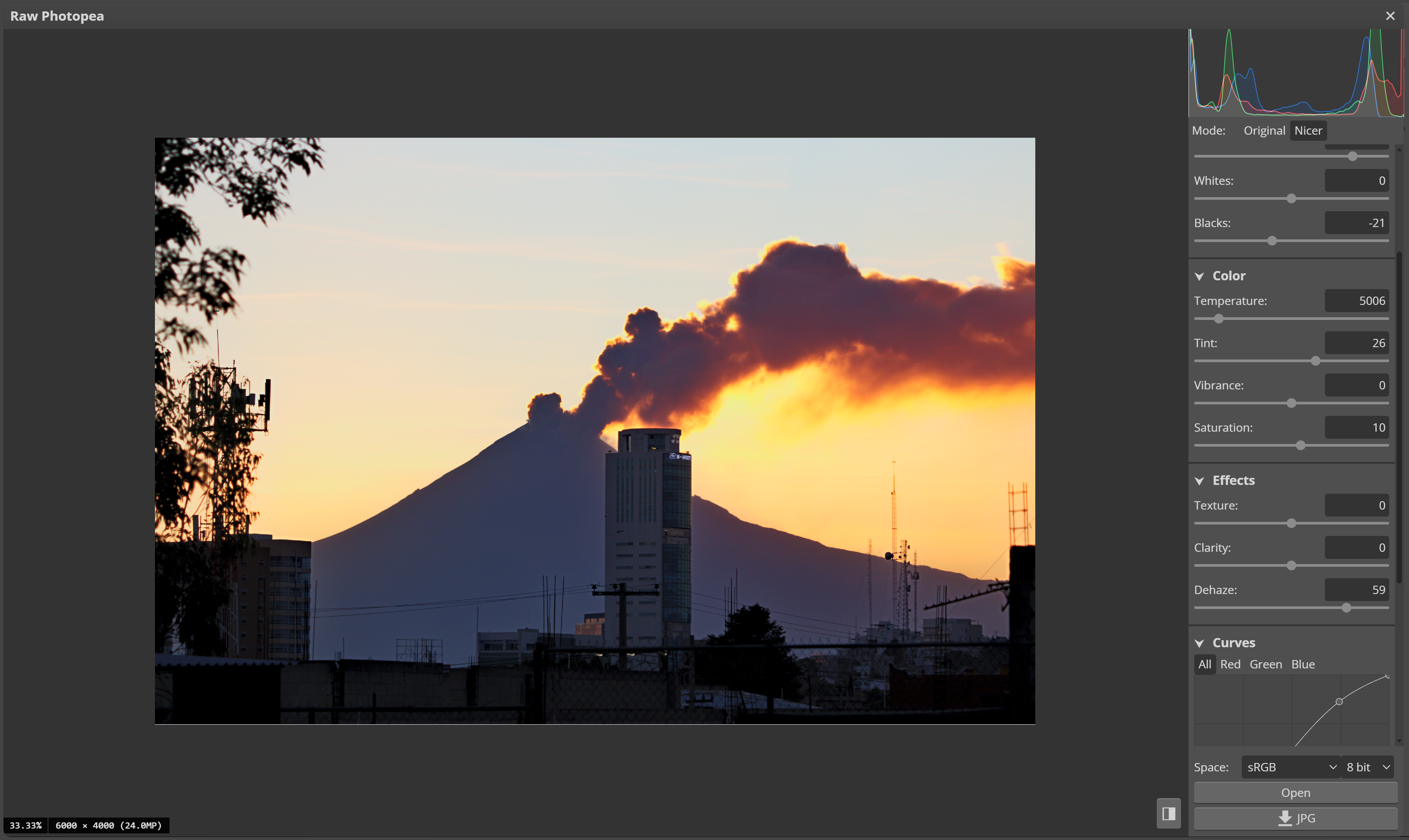 Photopea had no trouble opening and displaying most raw camera files I tried, such as Canon CR3 and Nikon NEF files. However, some files I loaded appeared corrupted. You don't have all the options you do when opening a raw file in Lightroom or Photoshop, such as color spaces, lens profile corrections, and presets. But you do get noise reduction sliders for Color, Protect Detail, and Strength. A recent "Nicer" option increased brightness and contrast to a good effect in some test shots. As mentioned, the raw import window now includes Clarity, Dehaze, Saturation, Texture, and Vibrance options, all of which should be familiar to Lightroom users.