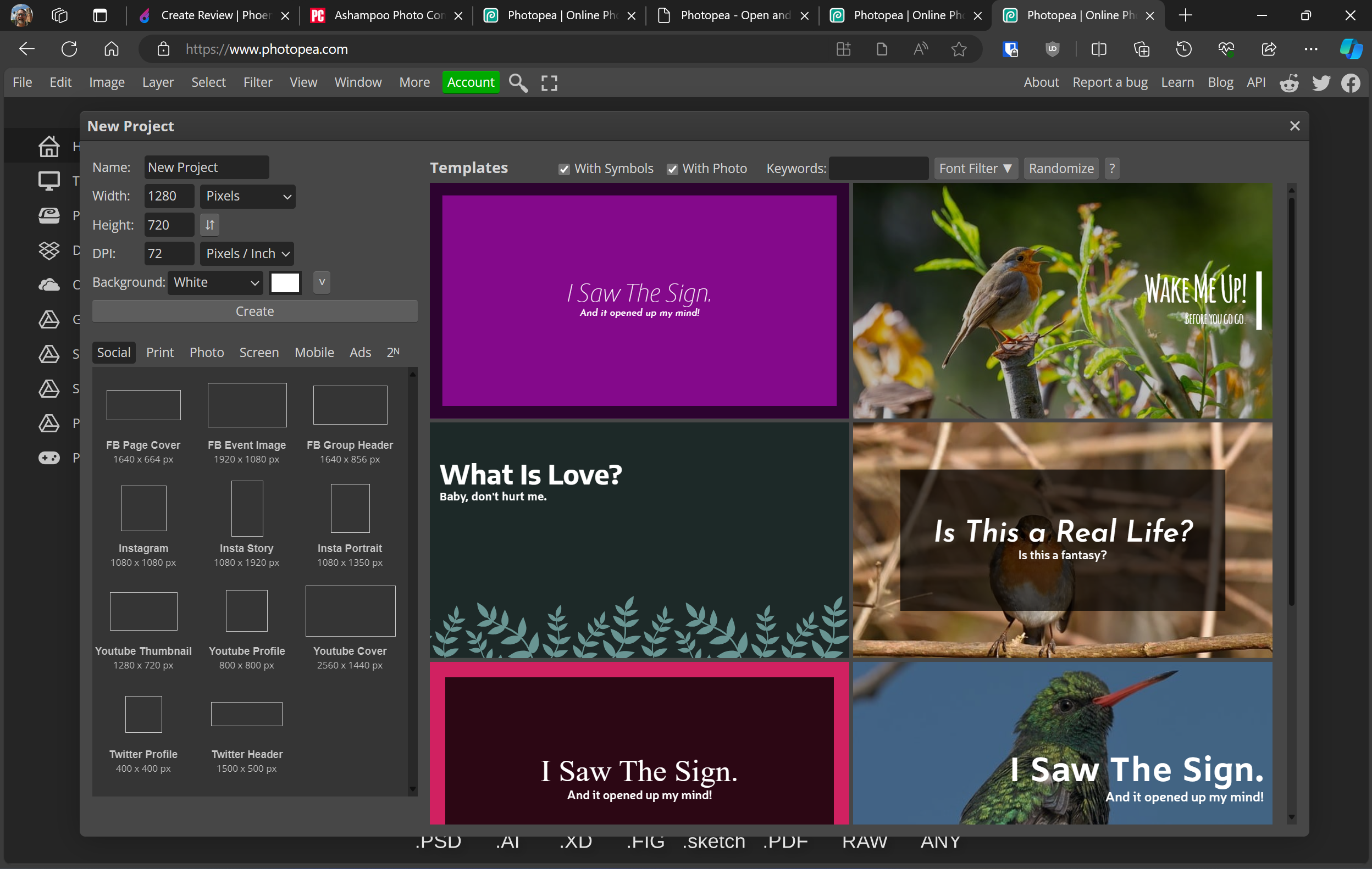 If you create a new image from scratch, Photopea, just like Photoshop, provides a respectable selection of templates.