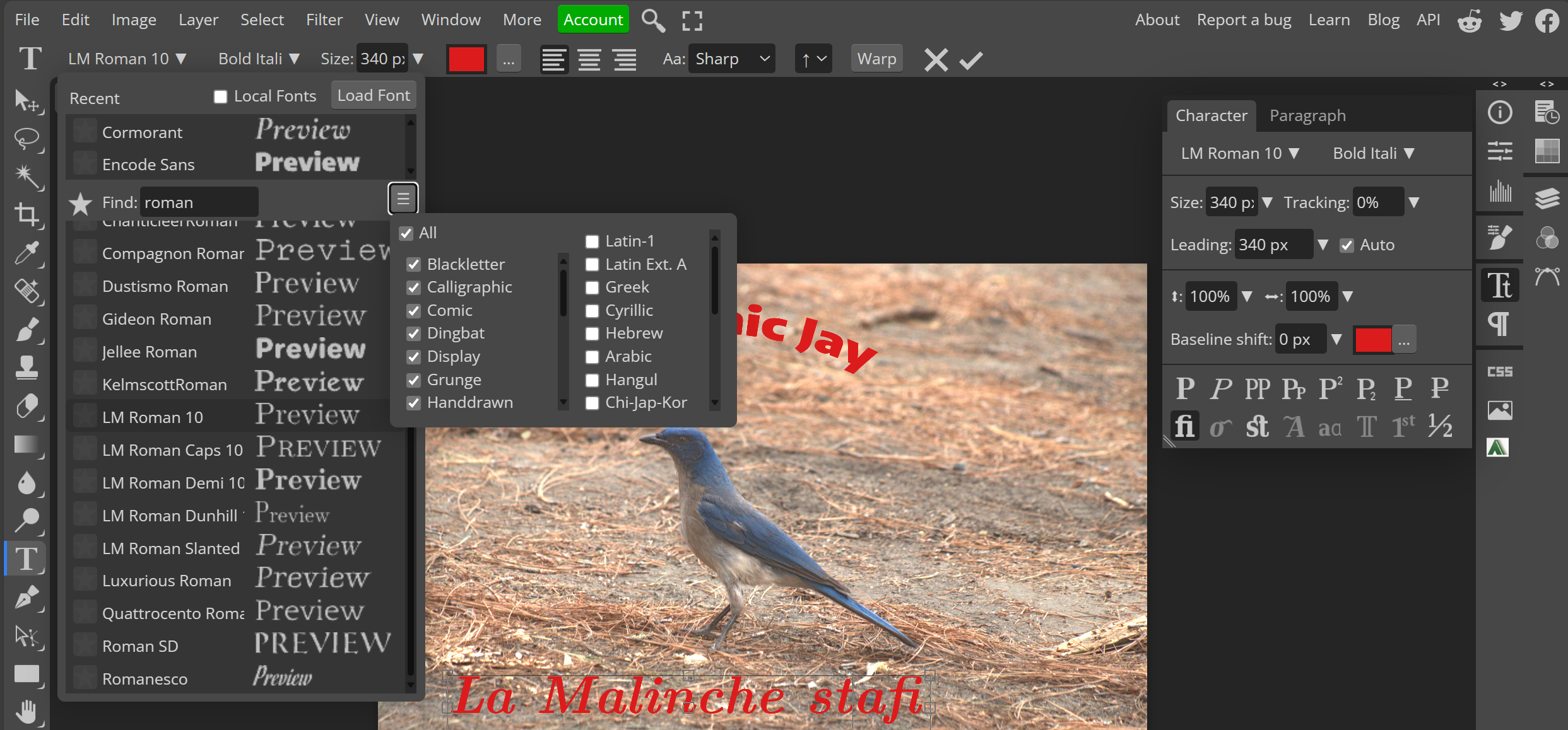 The program’s text tools are, once again, impressive for a free, browser-based app. It features both a Type tool and a Vertical Type tool, with options that allow you to present text in an arc. Tons of royalty-free font choices are at your disposal. In addition to the standard font styles, you get kerning (called horizontal scaling—in addition to vertical scaling), ligature, subscript, superscript, and tracking settings. You can even choose alternate glyphs. New support for variable fonts provides even more options.