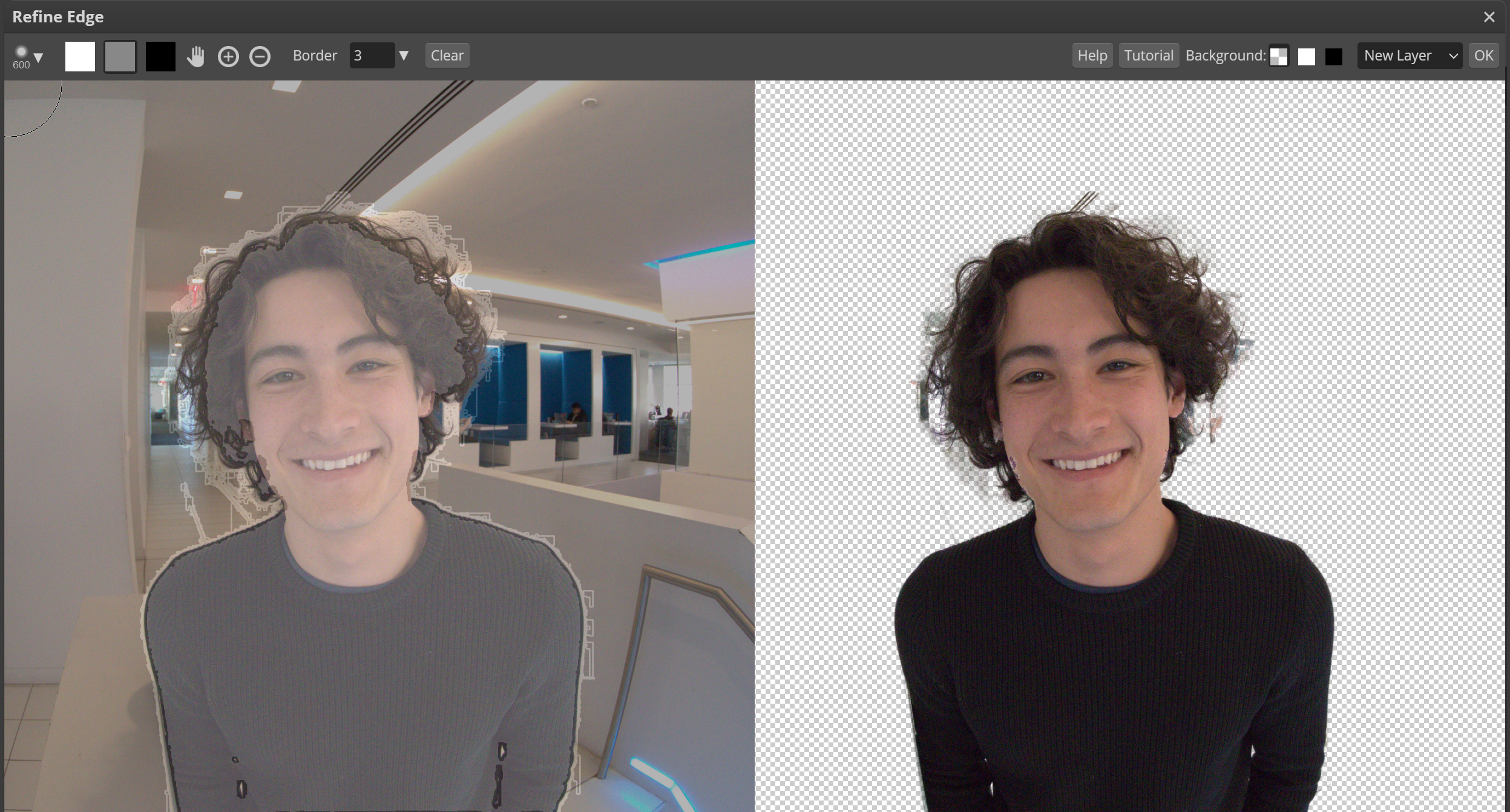 In the image below, you can see the Refine Edge view after using Subject Select: