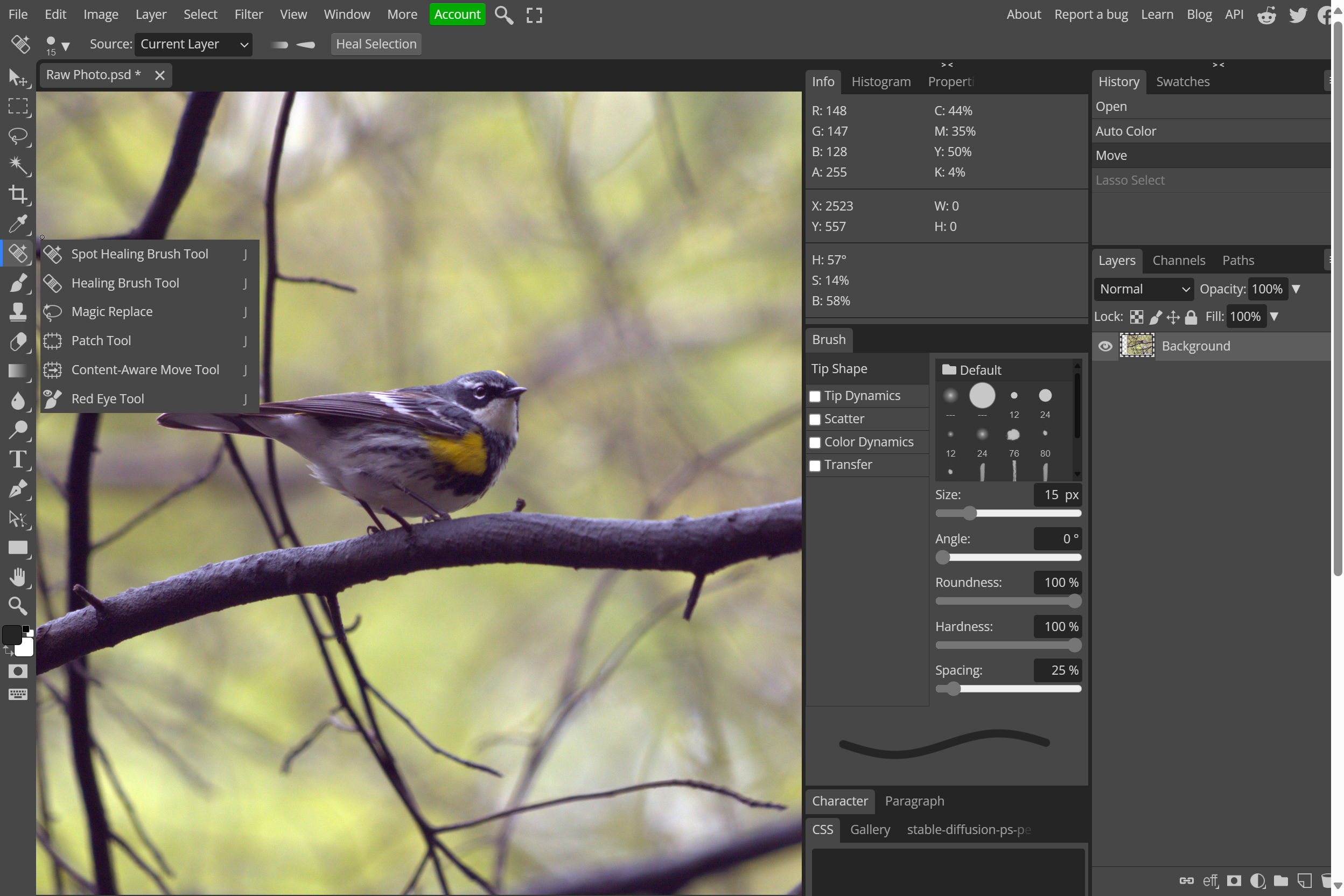 You don’t get quite the selection of brushes and brush options you do in Photoshop, and you might miss the Art History and History Brush options in that dominant software. However, you can import your own brushes in the ABR format. The brushes can have tip dynamics and color dynamics, which randomize those aspects as you stroke. A Scatter option allows for more random brushing results. In addition to the standard brush, Photopea includes Clone Stamp, Healing, Patch, Pencil, and Spot Healing choices.