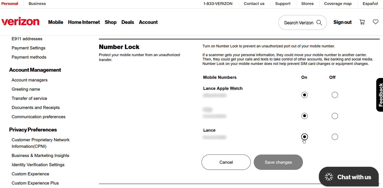 Verizon offers SIM protection and Number Lock, both of which should be enabled. SIM protection prevents unauthorized SIM or device changes, while Number Lock stops unauthorized number swaps. Sign in to your account at the Verizon website or through the My Verizon app. Select Account Overview > Profile & Settings > SIM Protection, then turn it on for each device on your plan. Next, click Number Lock and repeat the process.