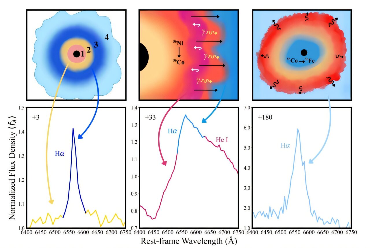 Astronomers from the University of California, Berkeley and other institutions have conducted a detailed study of a unique supernova known as SN 2021ukt. This particular event has shown a rare transition from Type IIn to Type Ib, offering new insights into the life cycles of stars. The findings from this research were shared on the arXiv pre-print server and provide a deeper understanding of this celestial phenomenon.