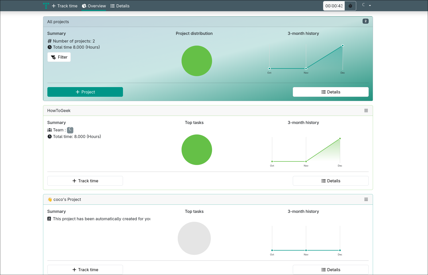 The Track tab is where you can start a stopwatch for specific tasks, while the Overview tab provides visual insights into your progress. The Details tab shows all your tracked work, allowing you to filter by client, project, time period, and billing status.
