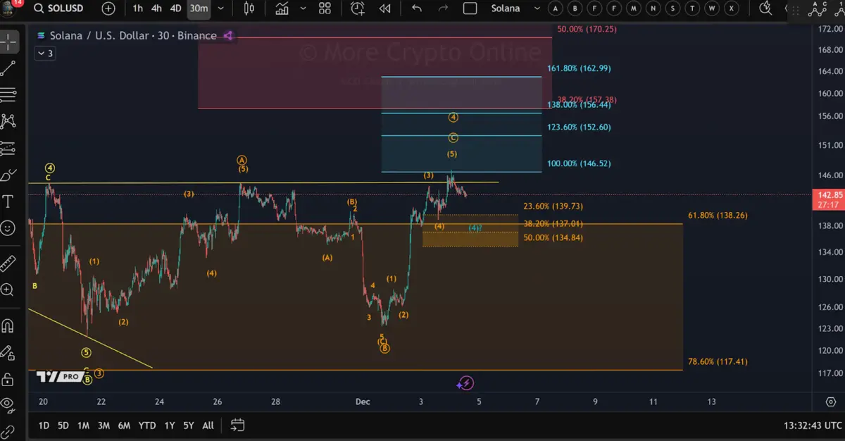 Solana has recently reached a key target zone, touching $146.50 overnight, just above the critical resistance level of $144.60, which is marked by the 100% Fibonacci extension. This development marks the completion of a 5-wave C structure and the formation of a complete A-B-C correction. Analysts suggest this could indicate the end of wave 4, although it remains to be seen if the price will drop below the strong support level of $134.80. If this occurs, another upward push is expected, potentially targeting the next resistance zone between $152.60 and $157.30.