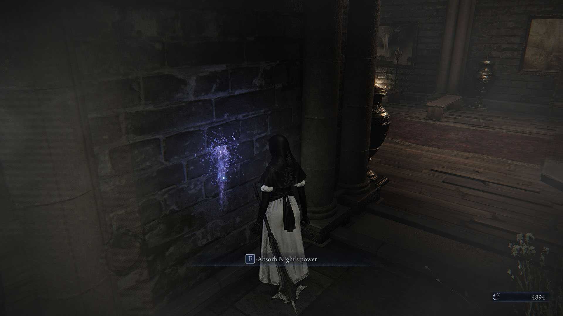 Winning the last battle will prompt a dialogue with Iron Menial where you apologize for your behavior. Next, interact with the blue-glowing portion of the wall near you and "absorb Night’s power." When you’re done with, uh, feeding from the Night’s power, you must go to the northwest side of the map, outside the Roundtable Hold to find the Scholar. Talk to them to receive the Leather Monocle Case item, then leave the remembrance by using the gateway beside you.