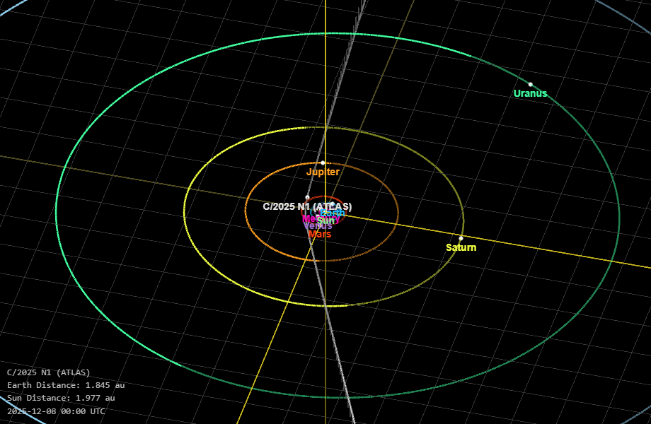 The comet 3I/ATLAS, which poses no threat to Earth, is expected to pass within about 170 million miles of our planet on December 19—roughly twice the distance between Earth and the sun. Although 3I/ATLAS is not visible to the naked eye, those with even a small telescope can observe it in the pre-dawn sky until spring 2026. NASA's "Eyes on the Solar System" online simulation shows the location and path of 3I/ATLAS as it moves through our solar system.