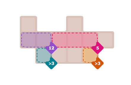 The 6/5 starts the orange 10 zone and closes the dark blue 9. Since there aren’t enough 1s for the purple equal zone, the 5/1 goes into the orange zone. This leaves the 5/2 to fill the >1 pink square in the upper right corner.