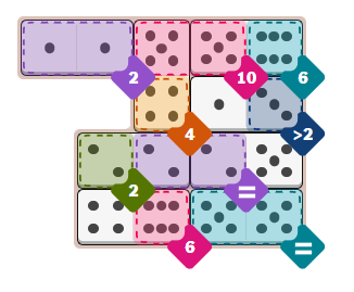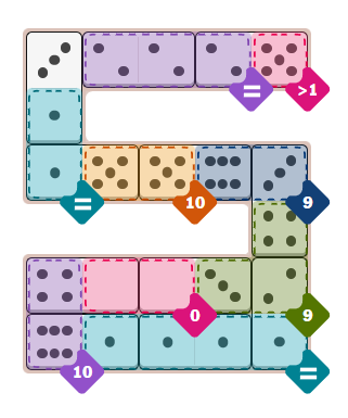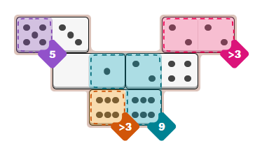 Pips is played on a grid filled with multicolored boxes, each representing a unique condition. The goal is to place dominoes in these zones so that they meet the specified requirements. Each domino has two numbers, and you can rotate them by clicking or tapping to find the best fit.