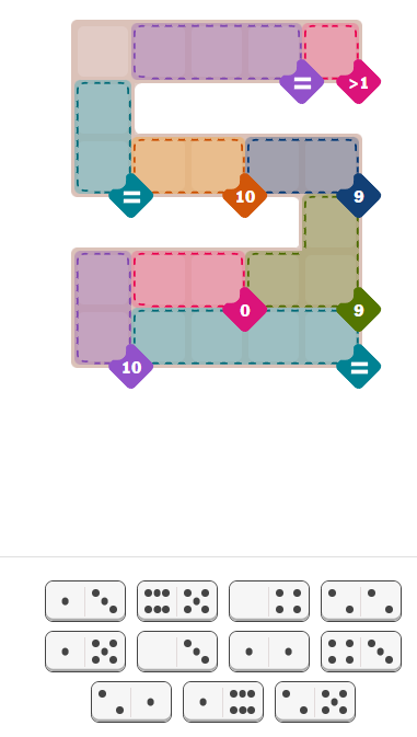 In a medium-level puzzle, for example, there might be four colored zones. One zone could require the total number of pips to equal 12, while others might demand that the numbers be greater than a certain value. As the difficulty increases, the conditions become more complex.